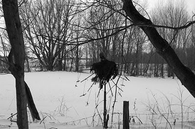 Here is a bucky I corpsed a long time ago. He's pretty bad looking and I'm kind of embarrassed to post it but thought this was kind of a neat pic with the snow. Better to hang him from a tree than keep taking up space in my shed. I don't care about what happens to him so I decided to just leave him up through the winter.